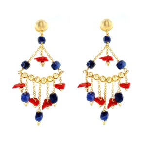 Orecchini pendenti Koliè della collezione Neres realizzati in argento dorato, coralli e sodalite.