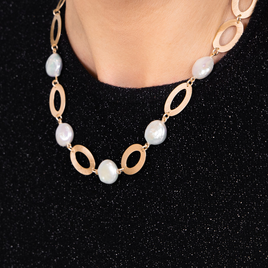 Collana Aquaforte della collezione Perle Vintage con perle barocche ed elementi ovali spazzolati in argento placcato oro giallo 23 carati.