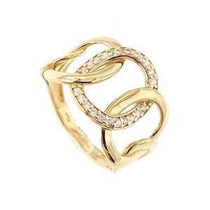 Anello in oro giallo con lavorazione a catena con dettaglio centrale valorizzato da pietre bianche incastonate.