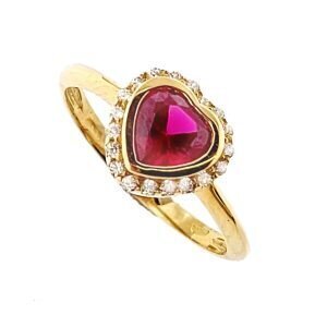 Anello in oro giallo con pietra centrale rossa a forma di cuore circondata da zirconi bianchi.