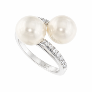 Elegante anello contrariรฉ in oro bianco con 2 perle di fiume e zirconi incastonati sulla parte superiore del gambo.