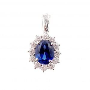 Ciondolo in oro bianco modello Kate con pietra blu sintetica centrale contornato di zirconi bianchi.