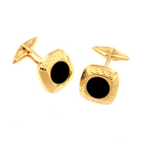 Gemelli da uomo quadrati in oro giallo con greca che contorna una pietra onice. Perfetti per l’uomo che vuole apparire.