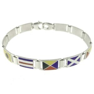 Bracciale Arcadia realizzato in argento con bandiere nautiche smaltate a fuoco. Chiusura con moschettone.
