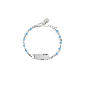 Bracciale bimbo Mabina Junior della collezione My-Tag in argento con piastra a forma di nuvoletta e catena rolò con gocce in smalto azzurro.