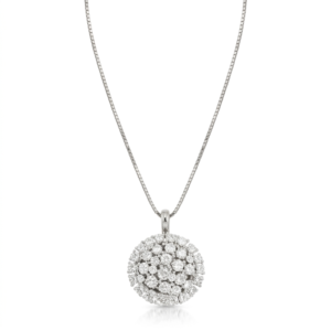 Collana realizzata in oro bianco con catenina veneziana e ciondolo con pavรฉ di diamanti. Chiusura con moschettone.