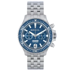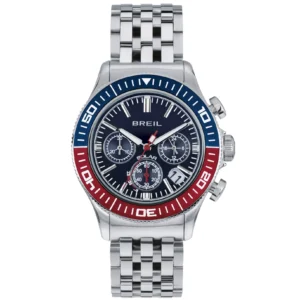 Orologio cronografo Breil della collezione Manta 1970 realizzato in acciaio, dotato di movimento solare con indicazione di riserva di carica a ore 6, unisce tecnica e stile. Il bracciale in acciaio a 7 maglie bilux è confortevole nell’indosso e si abbina a una cassa in acciaio lucido dalle anse pronunciate e geometriche. La lunetta unidirezionale blu e rossa con dettagli silver incornicia il quadrante blu, su cui spiccano le sfere rosse dei secondi e di un contatore.