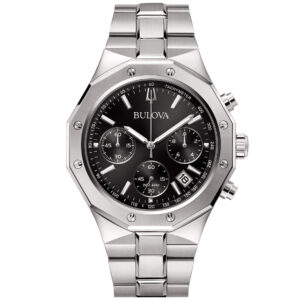 Orologio cronografo Bulova della collezione Octagon con bracciale e cassa realizzati in acciaio, quadrante nero e movimento al quarzo.