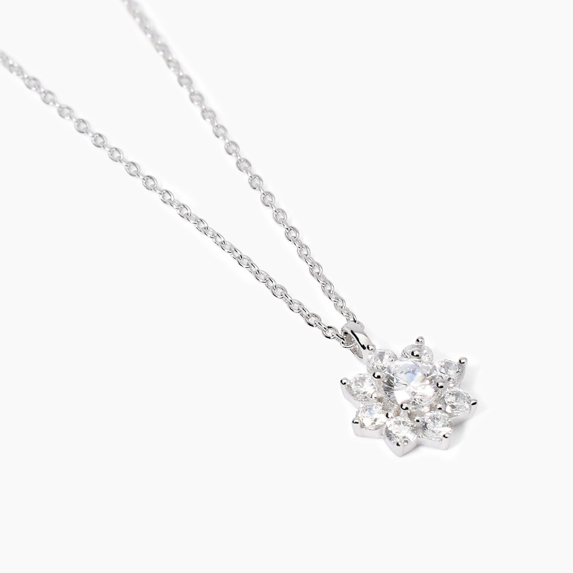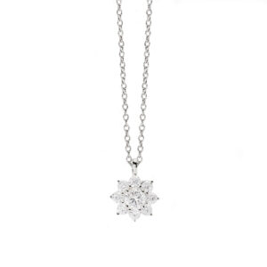 Collana Mabina della collezione Eden realizzata in argento rodiato con catena rolรฒ e ciondolo girasole in zirconi bianchi.