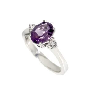 Anello realizzato in oro bianco ed impreziosito con ametista viola e due diamanti taglio brillante.