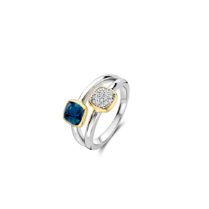 Anello Ti Sento in argento placcato oro presenta due anelli distinti, che si fondono con grazia con uno spazio tra di loro. Ogni anello presenta una pietra a forma di cuscino: uno รจ impreziosito da un’affascinante pietra blu scuro, mentre l’altro brilla con un pavรฉ di luminosi zirconi cubici bianchi. Entrambe le pietre sono incastonate in luminose montature placcate oro giallo, che ne esaltano la bellezza naturale. I gambi di entrambi gli anelli sono realizzati in argento placcato platino, che conferisce resistenza e lucentezza extra, mentre lo spazio aperto tra gli anelli aggiunge un tocco moderno e dinamico al design.