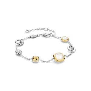 Bracciale TI SENTO realizzato in argento sterling 925 e placcato platino per una brillantezza duratura, questo bracciale presenta una splendida serie di charm geometrici quadrati. Alcuni charm sono impreziositi da un abbagliante pavรฉ di pietre di zirconia cubica bianca. Il pezzo centrale presenta un intarsio in madreperla, incastonato a mano in una lussuosa montatura placcata oro giallo, che aggiunge un tocco di opulenza.
