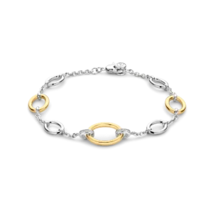 Bracciale Ti Sento a catena realizzato in argento placcato oro sfoggia un’armoniosa combinazione di eleganza contemporanea e raffinatezza senza tempo. Il suo design alternato presenta audaci maglie placcate oro giallo abbinate a ovali in argento lucido, il tutto interconnesso da una delicata catena. Ad accentuare il design centrale, due maglie placcate oro sono incorniciate da anelli di zirconia cubica incastonati a pavรฉ, aggiungendo un tocco di brillantezza abbagliante.