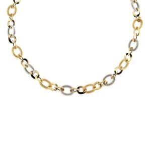 Collana in oro giallo e bianco ad anelli lucidi e satinati.