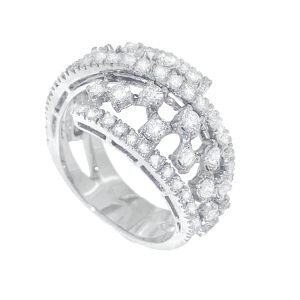 Anello in oro bianco con diamanti che compongono una decorazione unica su tutta la parte superiore del modello.