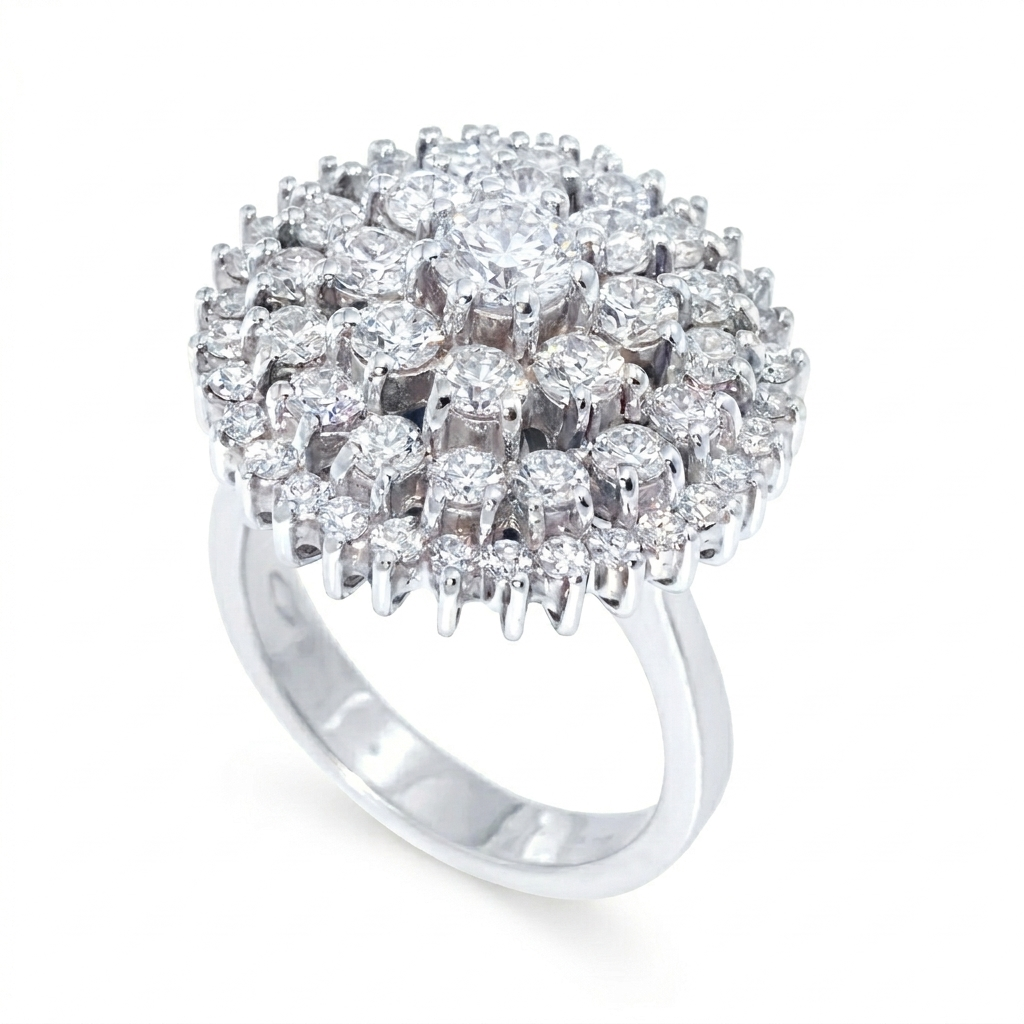 Anello in oro bianco e diamanti, a triplo contorno di dimensioni diverse, che formano un super-rosone.