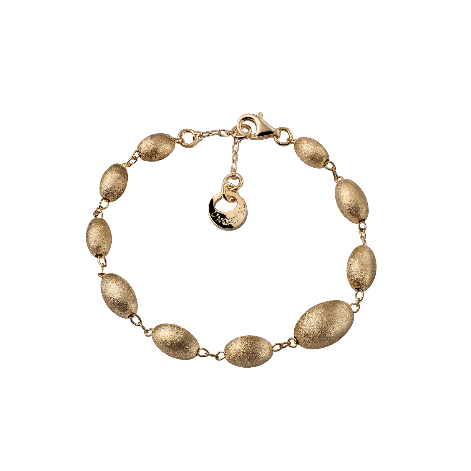 Bracciale Unoaerre della collezione Boule in argento dorato, catena sottile e perle ovali in finitura satinata.