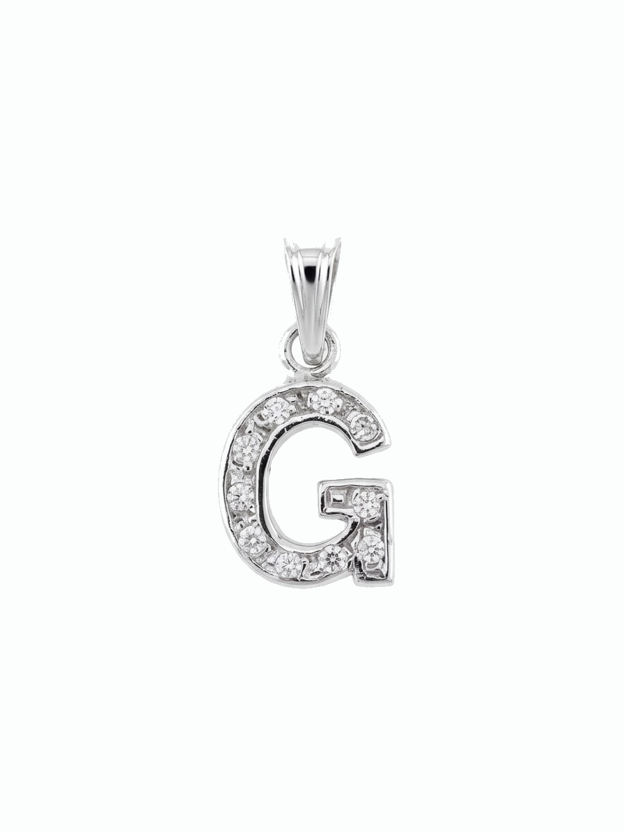 Ciondolo iniziale G in oro bianco con zirconi.