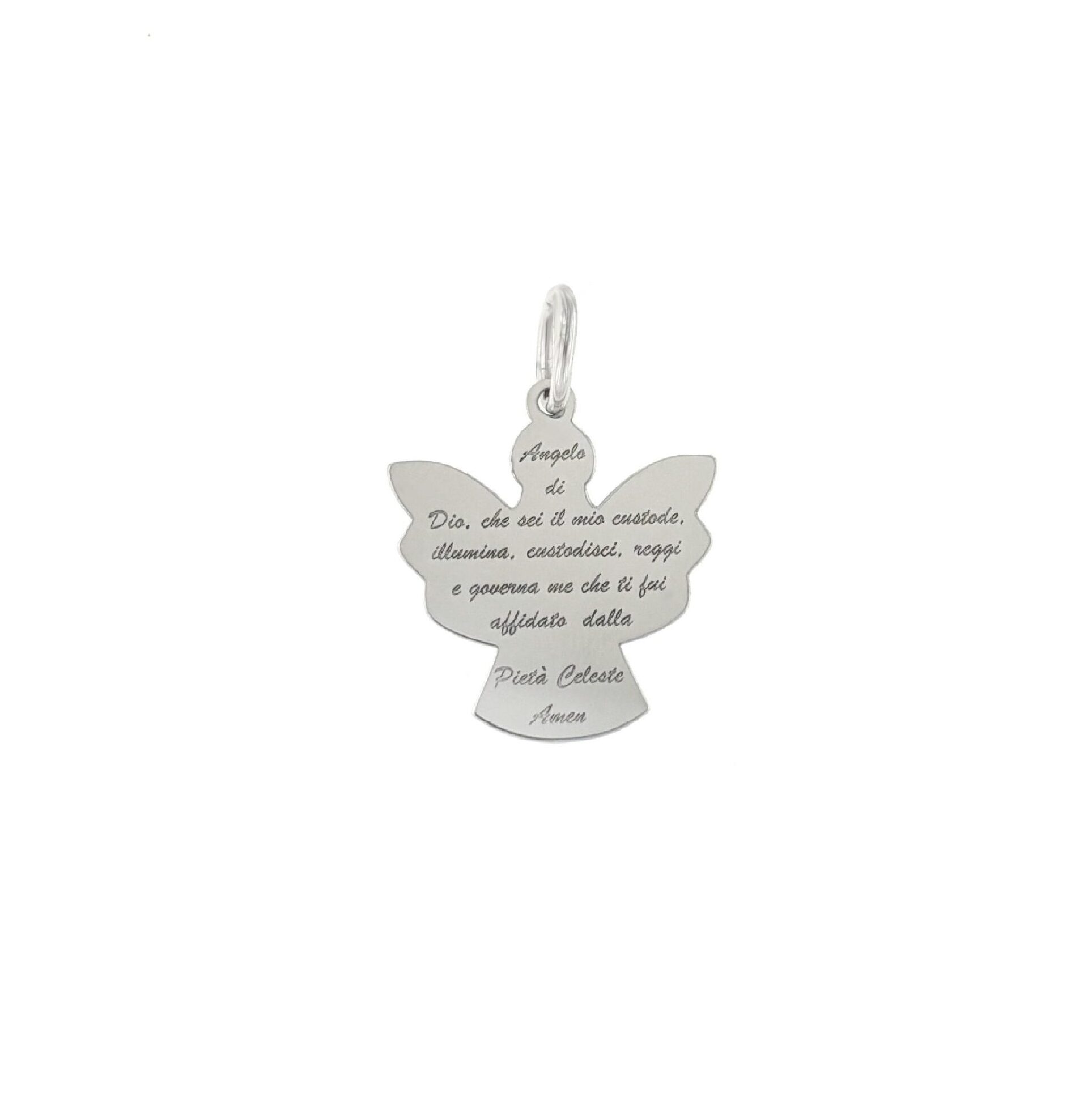 Ciondolo realizzato in oro bianco con preghiera incisa.