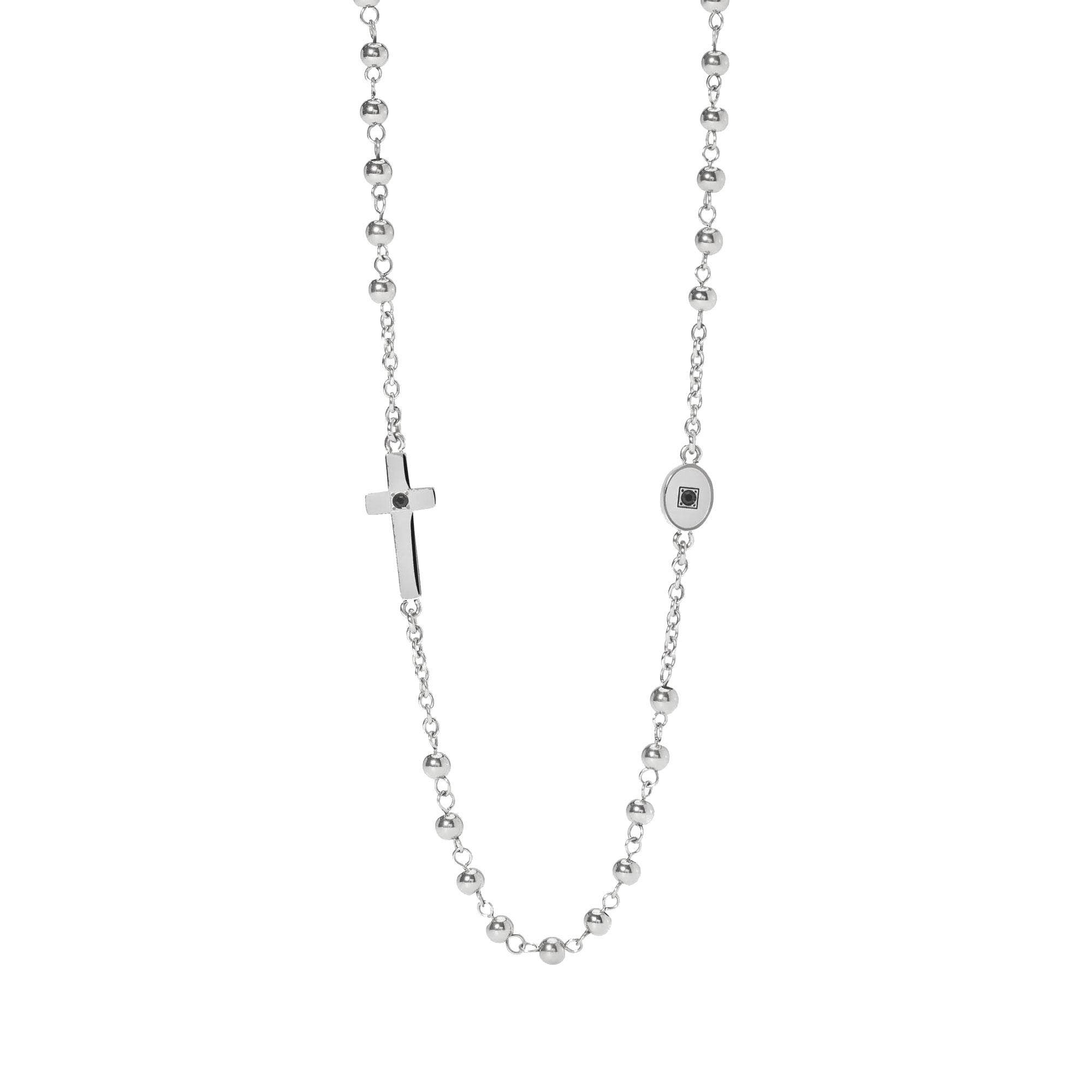 Collana Kidult della collezione Style in acciaio con catena forzatina, sfere, elementi ovale e croce con cristalli neri.