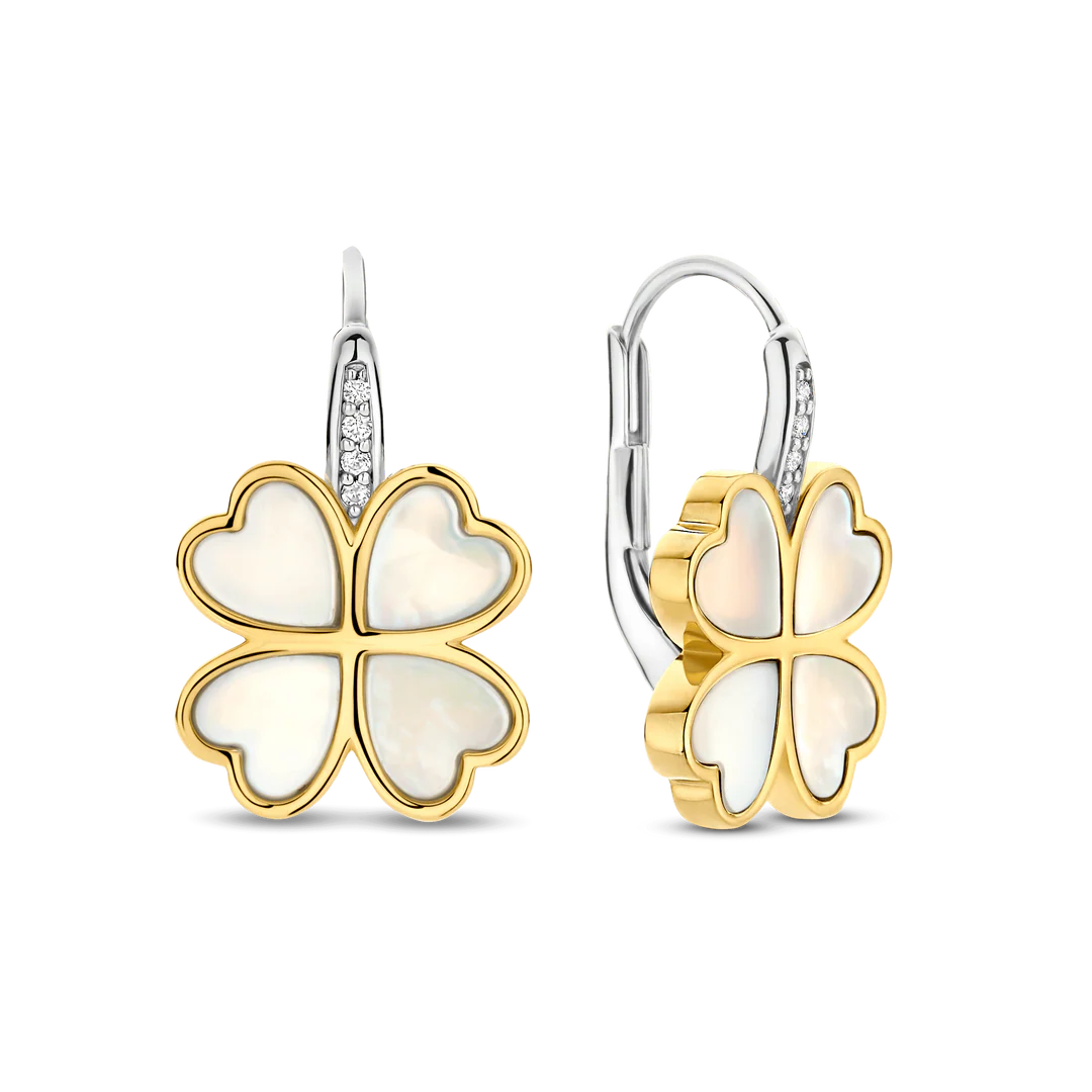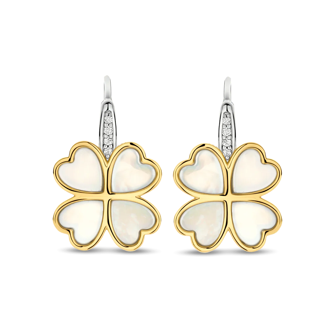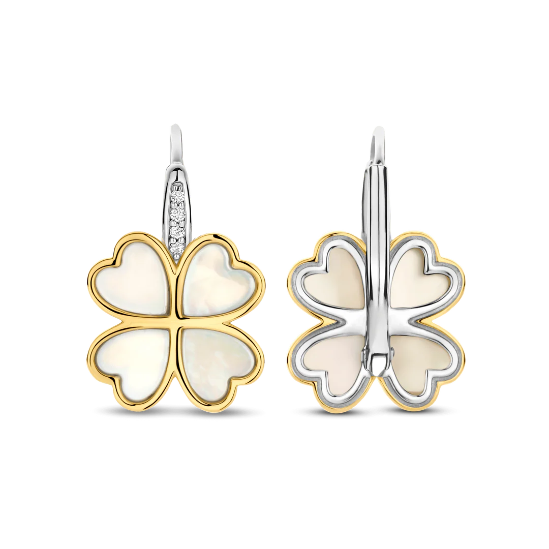 Orecchini Ti Sento pendenti a forma di quadrifoglio sono un simbolo di fascino senza tempo ed eleganza disinvolta realizzati in pregiato argento sterling 925. Questi orecchini pendenti sfoggiano una luminosa montatura a quadrifoglio placcata oro giallo, che racchiude luminosi intarsi in madreperla che brillano con tenui tonalità iridescenti, catturando luce e fortuna a ogni movimento. Sospesi a eleganti ganci a monachella placcati oro, questi delicati pendenti offrono una vestibilità sicura e una fluidità aggraziata.