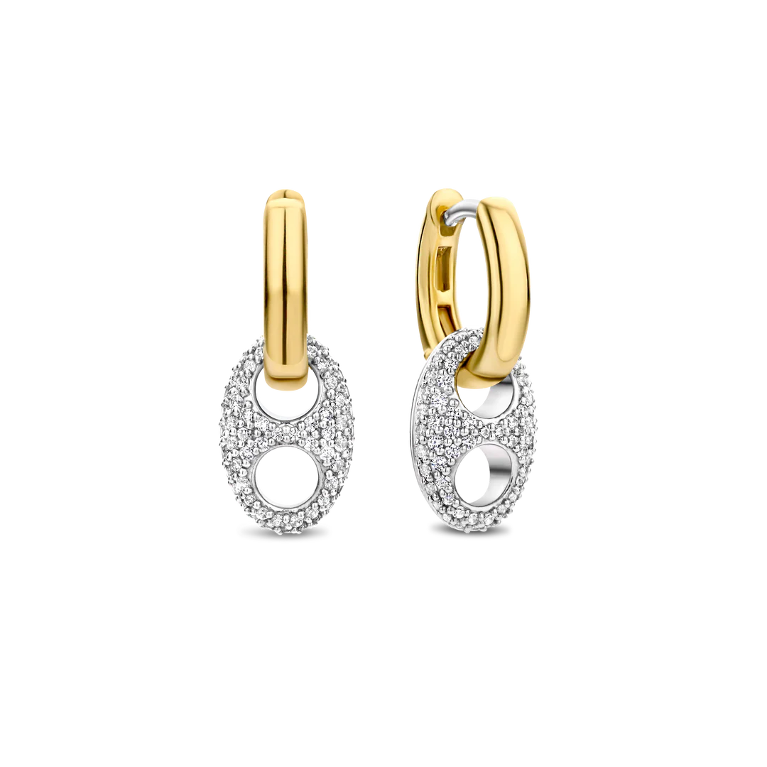 Orecchini TI SENTO della collezione Coffee Bean realizzati in argento placcato oro sfoggiano due simboli a forma di chicco di caffè incastonati a mano con un pavé di zirconi cubici bianchi. I ciondoli a forma di chicco di caffè pendono delicatamente dai loro piccoli cerchi placcati oro. Gli orecchini sono realizzati in argento sterling 925.
