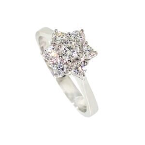 Anello realizzato in oro bianco con rosetta composta da sette diamanti taglio brillante.